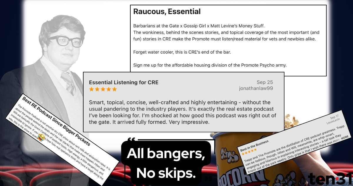 Our latest episode: Brookfield’s $10B play for YES! and how the Flatts of the world must chase AUM in far-flung asset classes; RXR’s OPM masterstroke in Manhattan; and Buccini Pollin’s long game in Wilmington. Spotify here, YouTube here or Apple Podcasts here. To get in front of our obsessed audience of CRE insiders, reach out here.