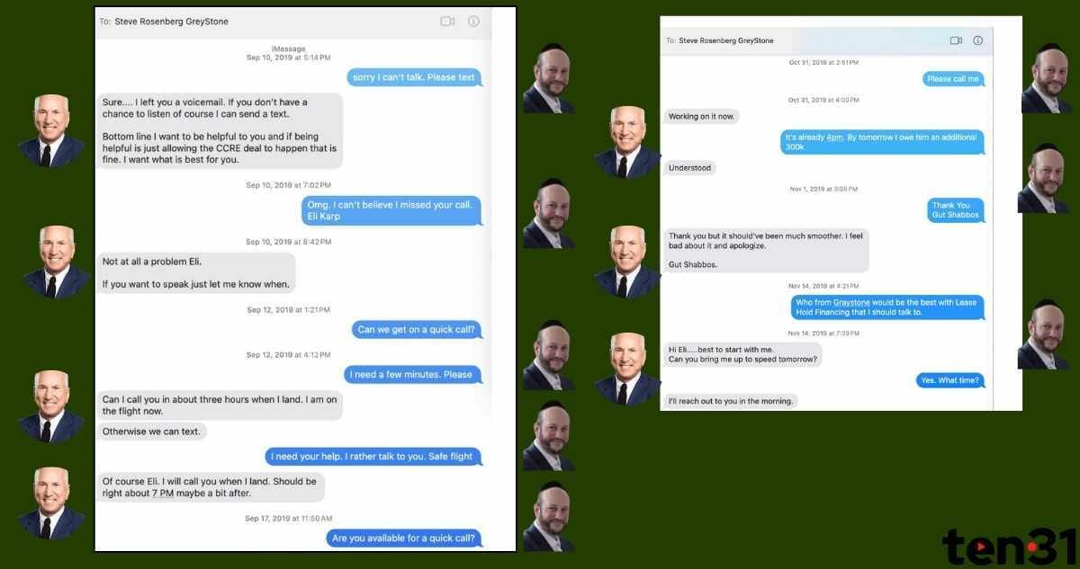 Hello Drama. So, Brooklyn developer Eli Karp is suing his lender Greystone & appraiser BBG, alleging the 2 were in cahoots on a loan-to-own scheme at one of his former Brooklyn properties that put him on the hook for $15M in PGs. The particulars of the suit – you can go read about them here – are a bit meh, b/c Karp has a history of blaming everyone but himself for his boulevard of broken deals. But one exhibit is electric: it’s a series of texts starting in fall ‘19 between Karp and Greystone boss Steve Rosenberg. It’s rare to get an unfiltered look at a sponsor-lender tête-à-tête like this, particularly on a distressed deal. (Promote Insiders: read on at the end of this email 👇)