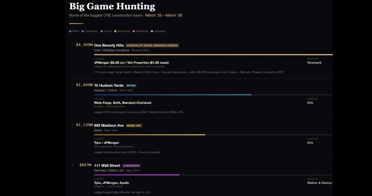 Vlad & the lad have done it: Doronin’s OKO Group & Jonathan Goldstein’s Cain International scored $4.3B in construction debt for their One Beverly Hills development, in what is one of the biggest-ever financing packages for a non-data center project. We’ve previously discussed how this was one of the more confounding capstacks we’ve seen – where does all that money go? – and have also gone in-depth on the pod on the fascinating history (Merv Griffin to the Brothers Candy to Beny Alagem) of the site. But now that the money has come in – $2.8B in sr. from JPM and $1.5B in mezz from REIT Vici – The Promote thought it the perfect excuse to look back at the landscape for some of the biggest construction loans over the past 12 months: Who’s doing them? Who’s getting them? And, just as crucially, who’s brokering them? Let’s dive in👇